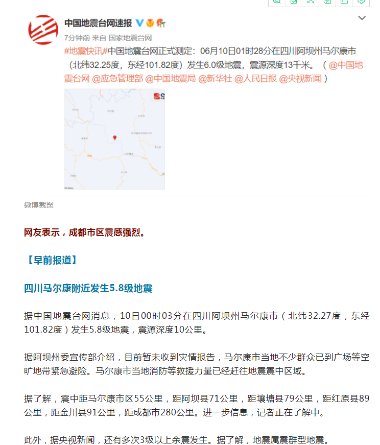 四川馬爾康附近發(fā)生多次地震,最高6.0級